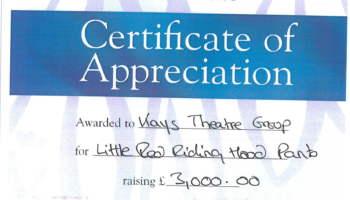 It Was nice to receive a certificate of appreciation for St. Richards Hospice for our latest donation of £3000 from our performances of “Little Red Riding Hood” and other fundraising we did in the last year.